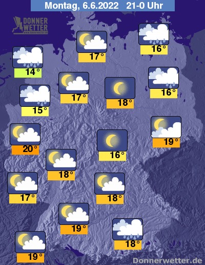 Die Temperaturen gehen bis Mitternacht auf Werte um 20 Grad im Rheinland und 14 Grad an der Nordseeküste zurück.