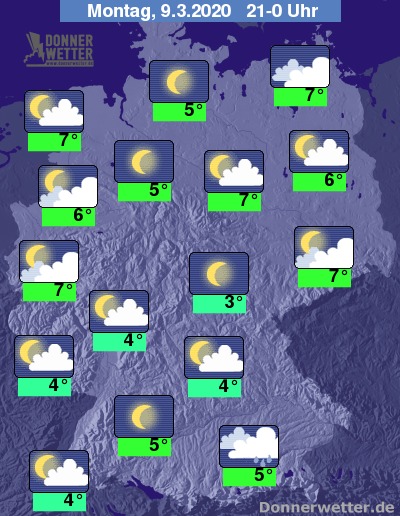 Die Temperaturen sinken am späten Abend auf Werte um 7 Grad im Rheinland und um 3 Grad im Thüringer Wald.