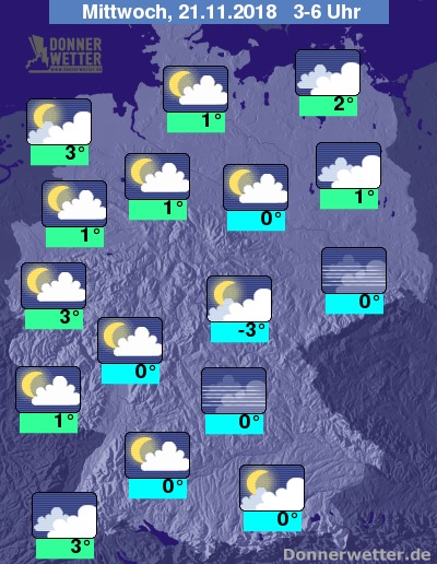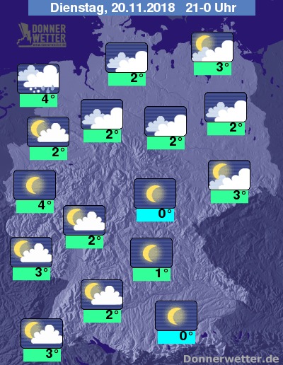 Bis Mitternacht lässt der Niederschlag nach und die Temperaturen gehen allgemein zurück. In Aufklarungsgebieten droht leichter Frost, sowie Glätte durch überfrierende Nässe.