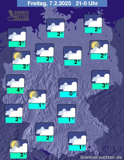 In der Nacht zum Samstag zeigt sich der Himmel über der Süd- und Osthälfte vielerorts nur gering bewölkt, gebietsweise kann sich Nebel bilden. In den übrigen Landesteilen bleibt es stark bewölkt oder bedeckt. Es bleibt trocken.