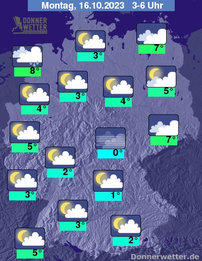 In der folgenden Nacht ist der Himmel verbreitet nur locker bewölkt oder sogar sternenklar. Im Norden ziehen jedoch oft auch dichte Wolken durch und es können sich vor allem im Küstenumfeld einzelne Schauer bilden. Im übrigen Land bleibt es trocken. Die Temperatur sinkt auf 8 Grad in Cuxhaven und 0 Grad in Erfurt.