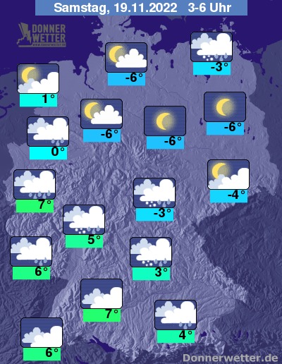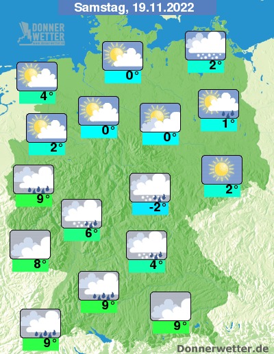 Am Samstag bleibt es über der Südhälfte überwiegend stark bis dicht bewölkt, dazu fällt gebietsweise Regen, Schneeregen oder Schnee. Weiter nach Norden zeigt sich das Wetter hingegen meistens heiter, teilweise auch sonnig, dabei bleibt es meistens trocken. Die Temperatur erreicht nur frostige -2 Grad im Vogtland und bis 9 Grad entlang des Rheins.