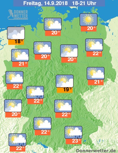 Am frühen Abend ist es teils heiter, teils wolkig. Südlich des Mains können noch örtliche Regengüsse nieder gehen. Sonst bleibt es in der Regel niederschlagsfrei. Im Nordseeumfeld trübt sich der Himmel bei auffrischendem Südwestwind allmählich ein. Vor Sonnenuntergang bewegen sich die Temperaturen bei noch recht angenehmen 18 bis 23 Grad. Der Wind