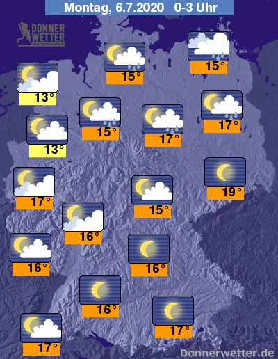 In der Nacht auf Montag wechselt sich lockere oder aufgelockerte Bewölkung über weiten Teilen des Landes ab; einen freien Blick in den Sternenhimmel gibt es anfangs noch im Süden und Südosten Deutschlands. Während es in der Südhälfte verbreitet trocken bleibt, muss im Norden regional mit einzelnen Schauern gerechnet werden.