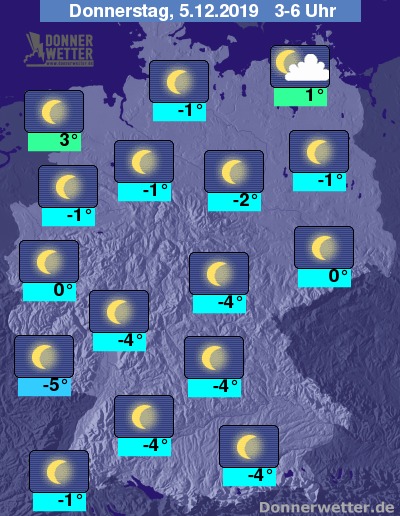 Bis zu den Frühstunden kühlt die Luft auf frostige Werte von -6 bis 0 Grad ab und es muss verbreitet mit Reifglätte gerechnet werden. Lediglich an den Küsten bleiben die Temperaturen im leicht positiven Bereich.
