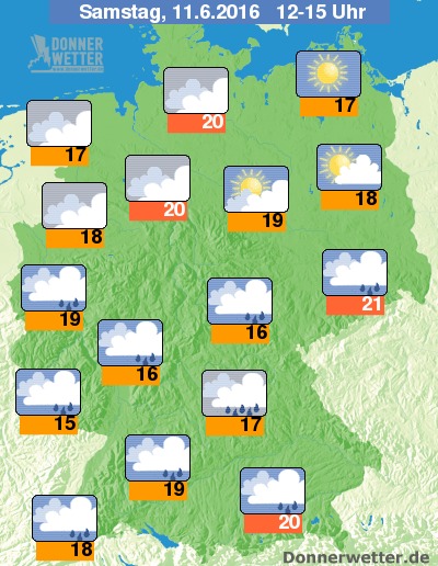 Heute Nachmittag bilden sich vor allem über der Südhälfte Deutschlands wiederholt Schauer und örtlich auch Gewitter, besonders nach Nordosten hin ist es aber auch verbreitet heiter oder sonnig und dazu trocken. Im übrigen Land ist es meist stark bewölkt, dabei jedoch weitgehend trocken. Die Temperatur liegt bei 15 Grad am Pfälzer Wald und etwa 21 Grad in Dresden.