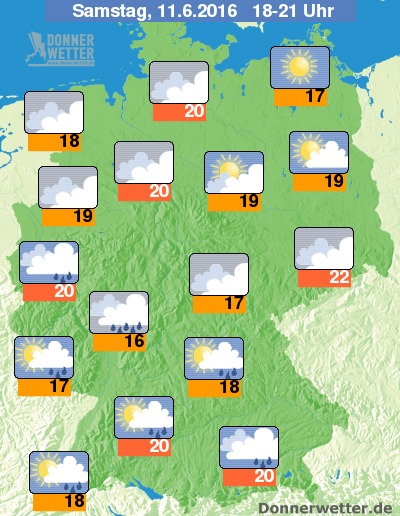 Heute Abend bilden sich im Süden bei oft starker Bewölkung zeitweise Schauer und hier und da auch Gewitter. Über der breiten Mitte und dem Nordwesten ist es ebenfalls meist stark bewölkt, jedoch weitgehend trocken. Deutlich freundlicher mit viel Sonnenschein ist es über dem Nordosten des Landes. Die frühen Abendwerte liegen bei 16 Grad am Taunus und um 22 Grad in der Lausitz.