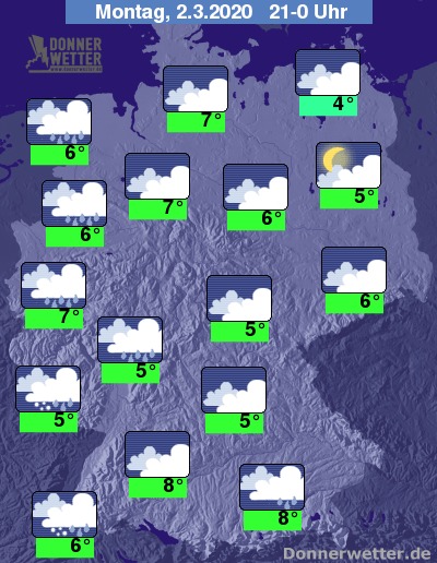 In den Abendstunden zeigt sich der Himmel verbreitet stark bewölkt oder bedeckt, nur in der Osthälfte überwiegt zunächst noch aufgelockerte Bewölkung. Im Westen muss in den kommenden Stunden immer wieder mit Schauern gerechnet werden, die später in höheren Lagen auch in Schneeregen oder Schnee übergehen können. In den übrigen Landesteilen bleibt es überwiegend trocken.
