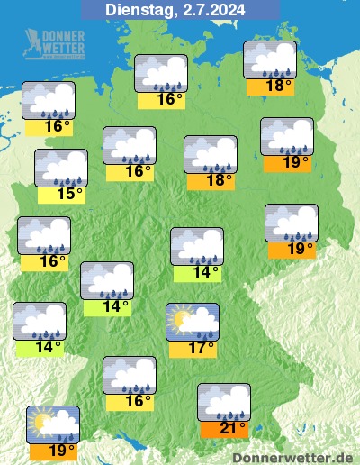 Am Dienstag zeigt sich der Himmel wechselnd oder stark bewölkt, dabei muss im Tagesverlauf immer wieder mit schauerartigem Regen gerechnet werden, auch lokale Gewitter sind möglich. Zum Nachmittag lassen die Niederschläge von Westen her allmählich nach.