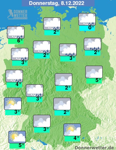 Am Donnerstag zeigt sich der Himmel meist stark bewölkt oder es ist bedeckt. Im Norden und Westen Deutschlands muss dabei immer wieder mit Regen oder Schneeregen gerechnet werden, im Bergland fällt Schnee. Im Süden bleibt es bei lokalen Auflockerungen meist trocken.