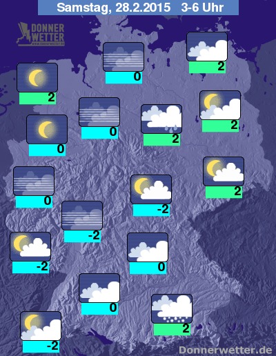 In der Nacht zum Samstag ist es in der Osthälfte des Landes größtenteils stark bewölkt und es fällt gebietsweise Regen, Schneeregen oder Schnee, dazu kann es stellenweise glatt auf den Straßen werden. Im Südwesten ist es ebenfalls meist stark bewölkt, aber hier bleibt es schon weitgehend trocken. Im Norden und Westen der Republik zeigen sich hingegen verbreitet die Sterne und es zieht hier und da leichte Bewölkung durch. Gebietsweise bildet sich jedoch Nebel oder Hochnebel, dazu besteht stellenweise Glättegefahr. Die Tiefstwerte liegen bei 2 Grad in weiten Teilen Berlin-Brandenburgs und bis -2 Grad am Bodensee.
