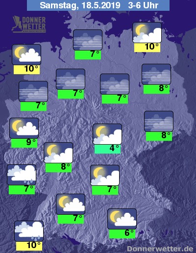 In der Nacht zeigt sich der Himmel über dem Norden des Landes überwiegend locker bewölkt, vereinzelt auch sternenklar; später bildet sich verbreitet Nebel. Im Süden überwiegt wechselnde oder starke Bewölkung. Es bleibt häufig trocken, eine erhöhte Schauerwahrscheinlichkeit besteht für den Nord- und Südwesten Deutschlands.