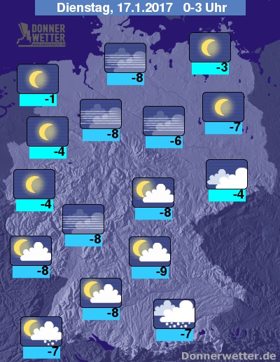 In der Nacht auf Dienstag klart der Himmel in weiten Teilen der Nordhälfte weiter auf, vielerorts kann sich Nebel oder Hochnebel bilden. Im Süden bleibt es zunächst bei lockerer Bewölkung, aus der vor allem südlich der Donau auch noch einzelne Schneeschauer fallen können.