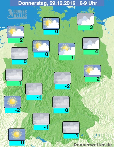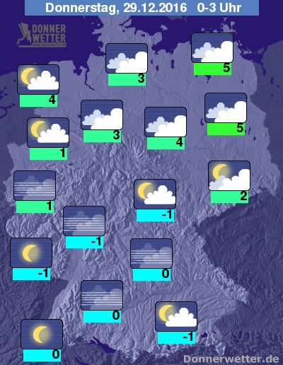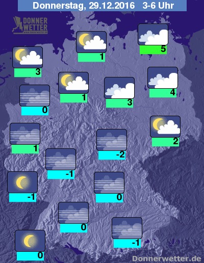 In der Nacht von Mittwoch auf Donnerstag ist der Himmel im Nordosten überwiegend bedeckt. In der zweiten Nachthälfte klart es hier etwas auf. Bis zu 3 Grad C plus werden hier gemessen. Im äußeren Südwesten weiterhin klarer Himmel. Eine dichte Nebelwand breitet sich in der Nacht zwischen Bayern und Münsterland aus.