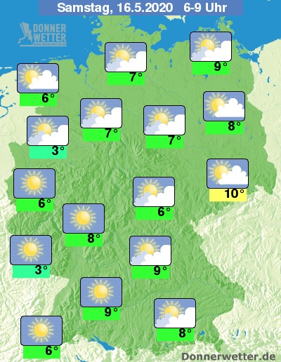 Bis zu den Frühstunden kühlt die Luft auf 7 bis 1 Grad ab. Es muss allerdings nochmals recht verbreitet mit Bodenfrösten gerechnet werden, stellenweise kann es auch zu leichten Frösten in 2 Meter Höhe kommen.