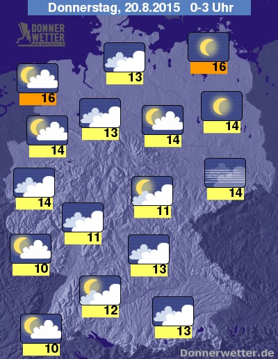 In der Nacht auf den Donnerstag zeigt der Himmel einen Wechsel von aufgelockerter und stärkerer Bewölkung an. Besonders im Oberfranken und an der Nordseeküste ist es bedeckt. In Der Sächsischen Schweiz wirds eine nebelige Nacht. Die Luft kühlt sich auf Tiefstemperaturen zwischen 16 Grad C und 10 Grad C ab.