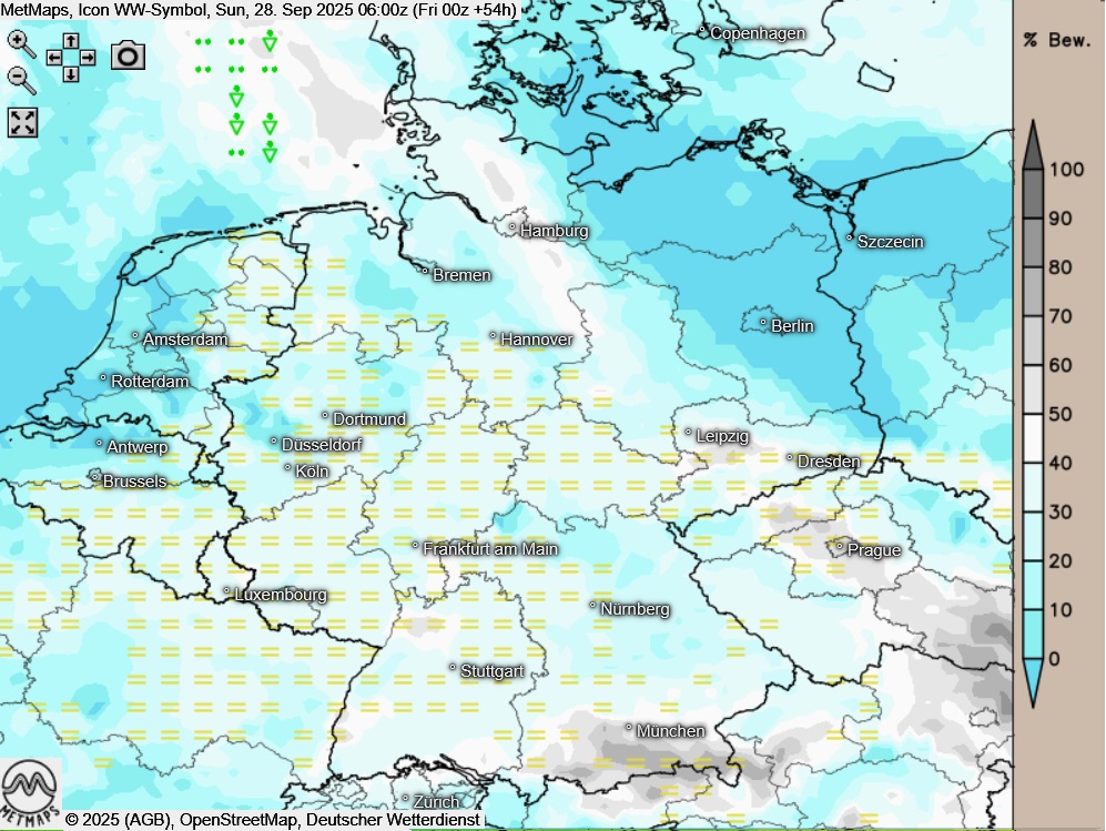 Die Wetter- und Bewölkungskarte mit Nebel für Sonntagfrüh (06:00 Uhr) sowie die 24-Stunden-Regenmengen am Sonntag nach Icon: