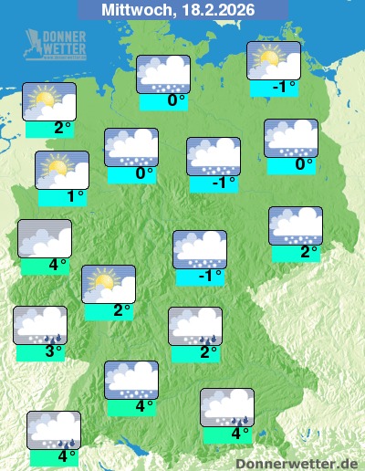 Am Mittwoch zeigt sich das Wetter meist stark bewölkt, vor allem im Norden können sich zum Teil Auflockerungen zeigend. Vor allem über der Osthälfte, aber auch im Südwesten fällt zeitweise Schnee oder Regen, sonst bleibt es zumeist trocken. Die Höchstwerte erreichen -1 Grad in der Magdeburger Börde und bis 4 Grad am Oberrhein.