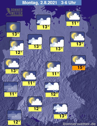 In der Nacht zum Montag bilden sich nur noch selten, am ehesten noch im Süden einzelne Schauer. Zumeist ist es gering bis wechselnd, im Süden jedoch größtenteils stark bewölkt. Die Temperatur sinkt auf 15 Grad in Dresden und bis 11 Grad in Saarbrücken.