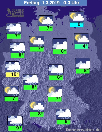 In den Nachtstunden zeigt sich der Himmel mal bedeckt, mal locker oder aufgelockert bewölkt und verbreitet muss in den kommenden Stunden mit Schauern gerechnet werden. Südlich der Donau, im äußersten Südosten sowie im Rheinland kann es phasenweise auch mal kräftiger regnen.