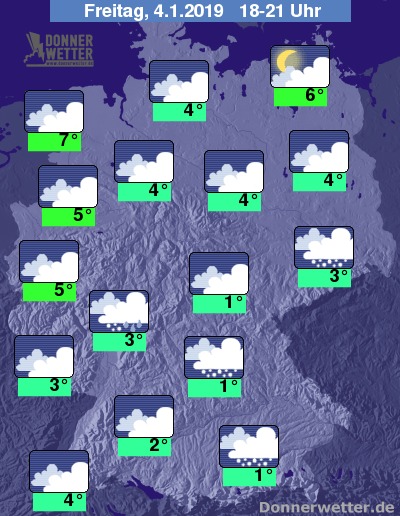 Am Abend fällt von Sachsen bis Bayern, sowie in der Landesmitte gebietsweise Schnee oder Schneeregen. Sonst bleibt es zwar bis auf kleinere Gebiete wolkenverhangen, aber weitestgehendst niederschlagsfrei, Später zieht von der Nordsee und Dänemark neuer Regen ins Land herein.