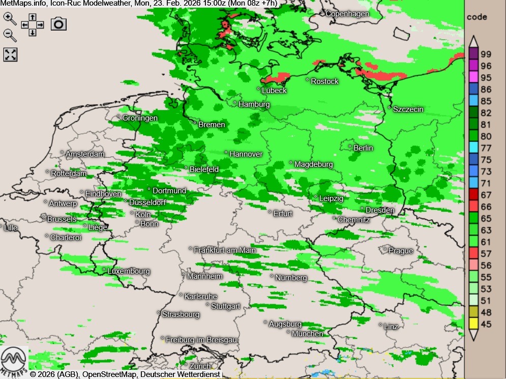 Am Montagnachmittag zeigt sich der Himmel über weiten Teilen des Landes wechselnd oder stark bewölkt, dabei muss zeit- und gebietsweise mit Schauern oder schauerartigem Regen gerechnet werden. Ab dem Abend greift von Südwesten neuer Regen auch auf die mittleren Landesteile über. Es weht ein mäßiger bis frischer, in Schauern auch stürmischer Westwind.