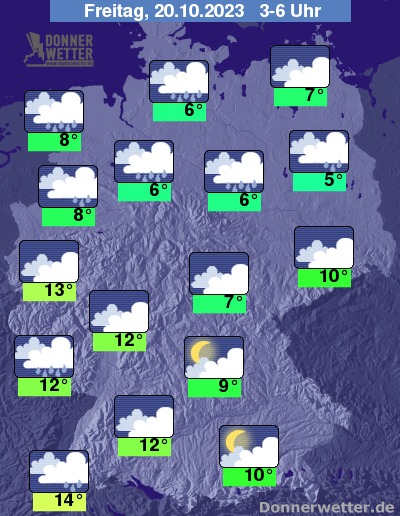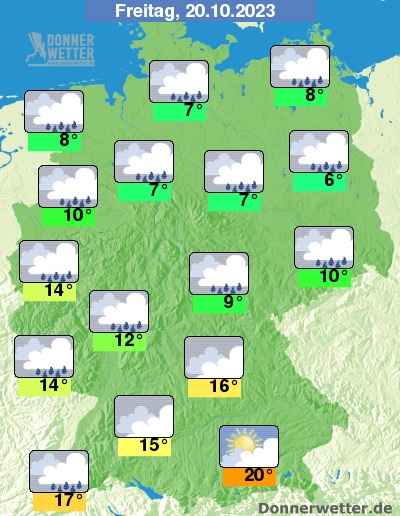 In der Nacht zum Freitag zieht ein breites Regenband in den Norden und Osten des Landes, während es weiter nach Südwesten hin zwar meist dicht bewölkt, aber trocken bleibt. Im weiteren Verlauf zieht jedoch von Südwesten her erneut Regen auf. Die Temperatur sinkt auf 14 Grad am Oberrhein und bis 5 Grad an der Oder. Im Norden weht zunehmend starker bis stürmischer Wind. An der Ostsee ist es meist stürmisch und an der Nordsee herrscht teils schwerer Sturm.