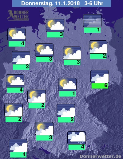 In der bevorstehenden Nacht ziehen im Südosten dichte Wolken und etwas Regen oder Schneeregen auf, besonders im Norden ist es verbreitet nur leicht bewölkt oder sternenklar. Im übrigen Bundesgebiet zeigt sich der Himmel teils aufgelockert, teils stark bewölkt, dazu bleibt es trocken. Die Temperatur sinkt auf 6 Grad in Dresden und bis 1 Grad an der Müritz.