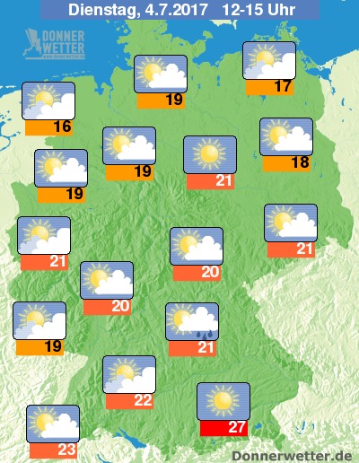Heute Nachmittag ist es überwiegend heiter oder sonnig, hier und da ziehen allerdings auch einige und zum Teil dichte Wolken auf. Von Bayern bis nach Sachsen sind dazu auch vereinzelte Schauer, selten auch Gewitter möglich, im übrigen Land bleibt es jedoch trocken. Die Temperatur liegt bei 16 Grad an der Nordsee und bis 27 Grad in München.
