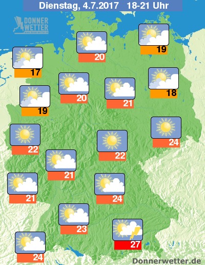 Heute Abend ziehen über Norddeutschland einige, meist aber lockere bis aufgelockerte Wolken hinweg, weiter nach Süden hin ist es hingegen verbreitet heiter bis sonnig. An den Alpen können sich bei teils dichten Quellwolken lokal Schauer und Gewitter entwickeln, sonst bleibt es aber trocken bei Werten zwischen 17 Grad in Cuxhaven und etwa 27 Grad in München.