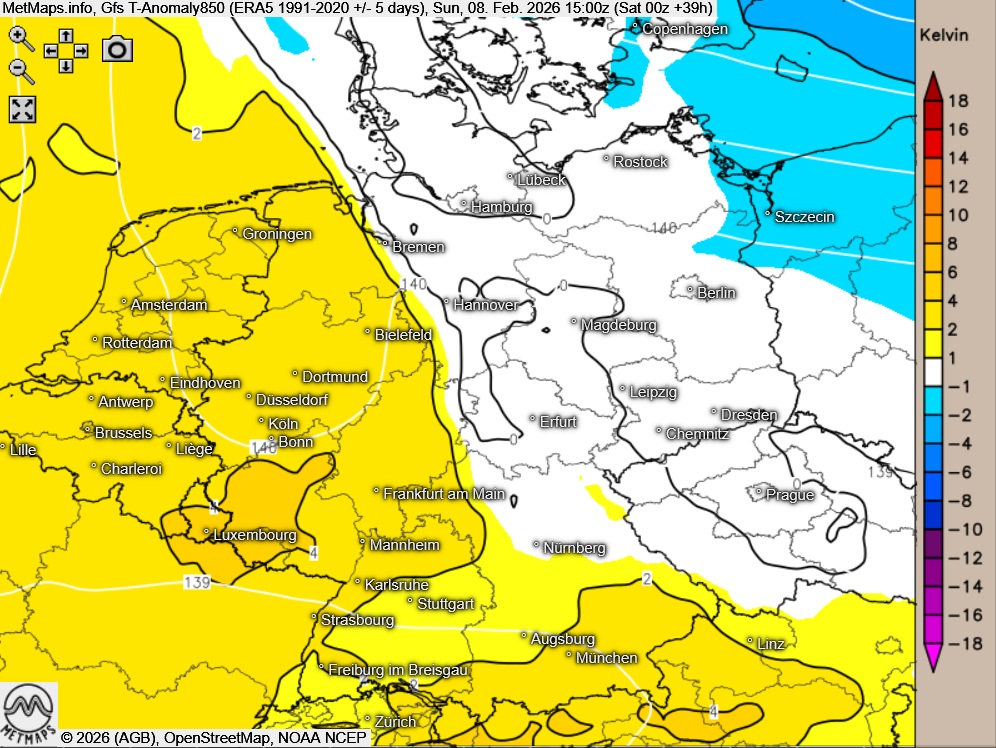 Die Wetter- und Strömungs- / Temperaturkarte sowie die Temperaturabweichung um 15:00 Uhr nach GFS:
