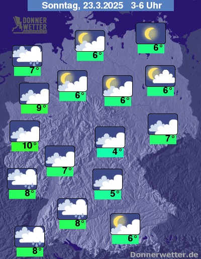 In der Nacht zum Sonntag bleibt es im äußersten Norden und Nordosten sternenklar oder es ist nur gering bewölkt. In den übrigen Landesteilen überwiegt wechselnde oder starke Bewölkung, in der Westhälfte fällt dabei teils schauerartiger Regen.