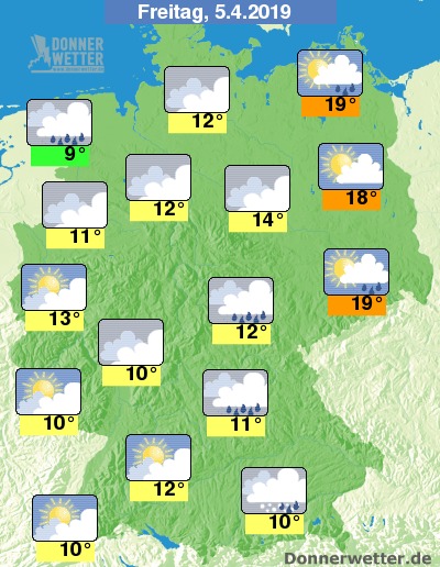 Die Höchsttemperaturen liegen allgemein zwischen 9 und 15 Grad, im Nordosten können gebietsweise bis nahe 20 Grad erreicht werden.