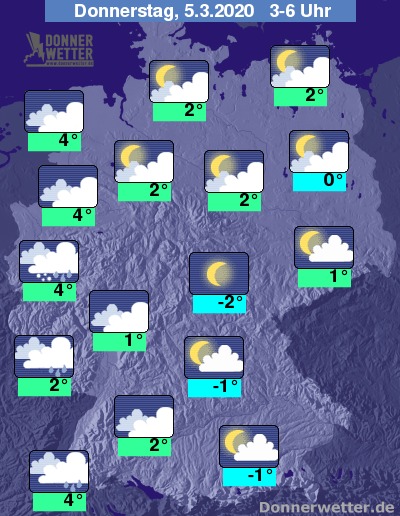 Die Temperaturen sinken in der Nacht auf Werte um 4 Grad am Niederrhein und um -2 Grad im Thüringer Wald.