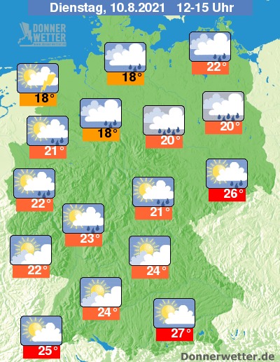 Heute Nachmittag ist es über der Nordhälfte teils stark, teils auch aufgelockert bewölkt, dabei bilden sich vielerorts Schauer, örtlich sind auch Gewitter möglich. Weiter nach Süden hin ist es zum Teil heiter, teils ziehen auch hier einige Wolken durch, dabei bleibt es trocken. Die Temperatur liegt bei 18 Grad in der Norddeutschen Tiefebene und bis 27 Grad in Oberbayern.