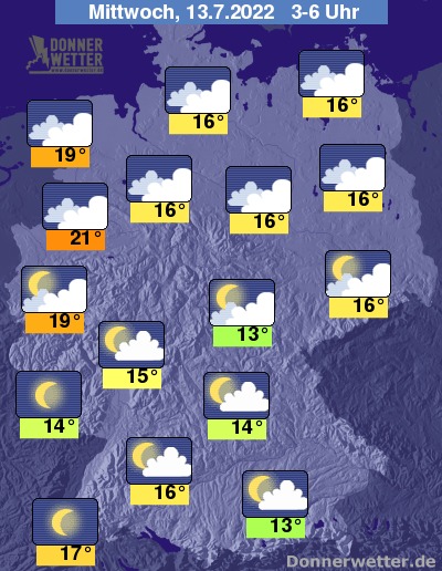 In der Nacht zum Mittwoch zeigt sich der Himmel über der Südhälfte des Landes locker bewölkt oder sternenklar, weiter nach Norden hin ist es hingegen überwiegend stark bewölkt, jedoch bleibt es trocken. Die Temperatur sinkt auf teils tropische 21 Grad in Meppen und etwa 13 Grad in München.