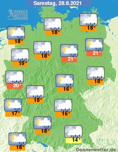 Am Samstag ist es meist stark bewölkt oder bedeckt, dabei bilden sich wiederholt Schauer, örtlich entwickeln sich auch mögliche Gewitter. Jedoch zeigen sich gebietsweise auch Auflockerungen. Die Temperatur steigt auf 14 Grad in Augsburg und bis 21 Grad in Magdeburg.