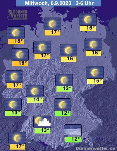 In der bevorstehenden Nacht zeigt sich der Himmel über dem Bundesgebiet weitgehend wolkenfrei. Im Süden sind noch am ehesten einige Wolken möglich. Es bleibt landesweit trocken bei Tiefstwerten von 18 Grad an der Ems und bis 12 Grad im Berchtesgadener Land.