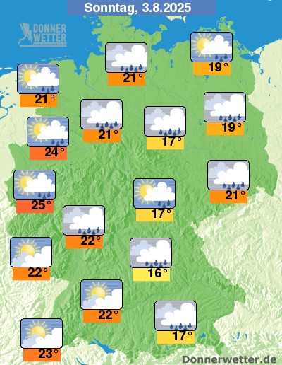 Am Sonntag hält sich zumeist starke Bewölkung, hier und da, jedoch vor allem im Süden ist es auch teils aufgelockert bewölkt. Es bilden sich vielerorts Schauer, Gewitter bleiben hingegen eher selten. Die Temperatur steigt auf 16 Grad in Oberfranken und bis 25 Grad in der Kölner Bucht.