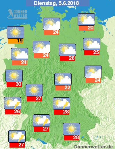 Am Dienstag bleibt es nördlich des Mains verbreitet heiter bis sonnig und dabei trocken. Weiter nach Süden hin scheint zwar auch häufig die Sonne, jedoch können sich hier im Tagesverlauf örtliche Schauer und Gewitter entwickeln. Die Temperatur steigt auf 19 Grad an der Nordsee und bis 30 Grad im Rheinland.