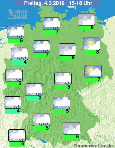 Am Sonntag verbreitet dichte Wolken, vor allem über der Nordhälfte häufig Regen, teils Schnee, im Süden nur vereinzelt etwas Schnee oder Regen, 2 bis 6 Grad.