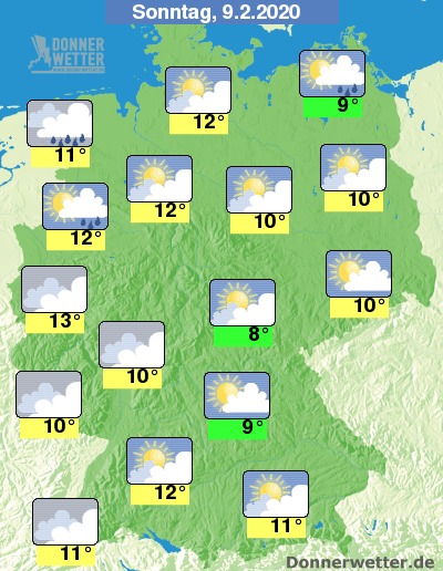 Am Sonntag ist es im Osten und Süden noch oft heiter, jedoch ziehen im Tagesverlauf auch zunehmend mehr Wolken auf. Im übrigen Land ist es stark bewölkt und ab dem Nachmittag setzt zuerst im Norden, gegen Abend auch im Westen Regen ein, sonst bleibt es aber trocken. Über der Nordwesthälfte weht ein starker, zunehmend stürmischer Wind. An der Nordsee herrscht teils schwerer Sturm. Die Temperatur erreicht milde 8 bis 13 Grad.