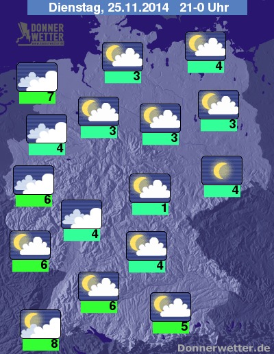 Heute Abend ziehen auch in der Osthälfte des Landes meist lockere, jedoch harmlose Wolken durch. Ganz im Osten bleibt es aber noch häufig sternenklar. Nach Westen und Südwesten hin bleibt es bei meist starker, teils aber auch aufgelockerter Bewölkung. Es bleibt überall trocken. Die Abendtemperatur liegt bei 8 Grad in Freiburg und etwa 1 Grad im Vogtland.