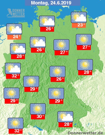 Am Montag ist es den Tag über verbreitet sonnig und trocken. An den Küsten ziehen hier und da, sonst nur selten lockere Wolken durch. Die Temperatur erreicht 23 Grad in Rostock und bis 32 Grad in Düsseldorf.