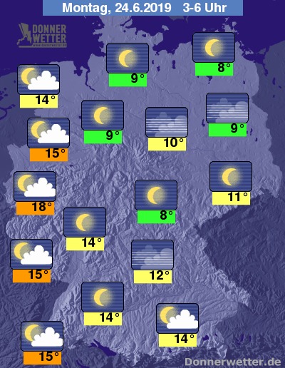 In der Nacht zum Montag ist der Himmel zunächst fast landesweit sternenklar, in den westlichen Landesteilen ziehen im Laufe der Nacht einige, weitgehend jedoch lockere Wolken durch, dazu bleibt es trocken. Die Temperatur sinkt auf 18 Grad in der Kölner Bucht und bis 8 Grad im Eichsfeld.