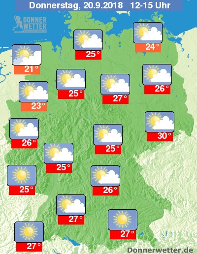 Am frühen Nachmittag ziehen über die Nordhälfte zum Teil Schleierwolken hinweg. Sonst strahlt jedoch verbreitet wieder die Sonne und bringt nochmals sommerliche Temperaturen von 25 bis 30 Grad. Kühler bleibt es im Nordwesten und in Küstennähe.