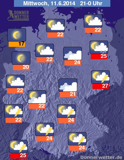 Am Nachmittag bilden sich vom Schwarzwald bis zum Niederrhein teils kräftige Schauer und unwetterartige Gewitter. Bei vielfach schwülheißen Temperaturen bleibt es in der Osthälfte meist trocken, aber auch hier besteht ein leichtes Gewitterrisiko.