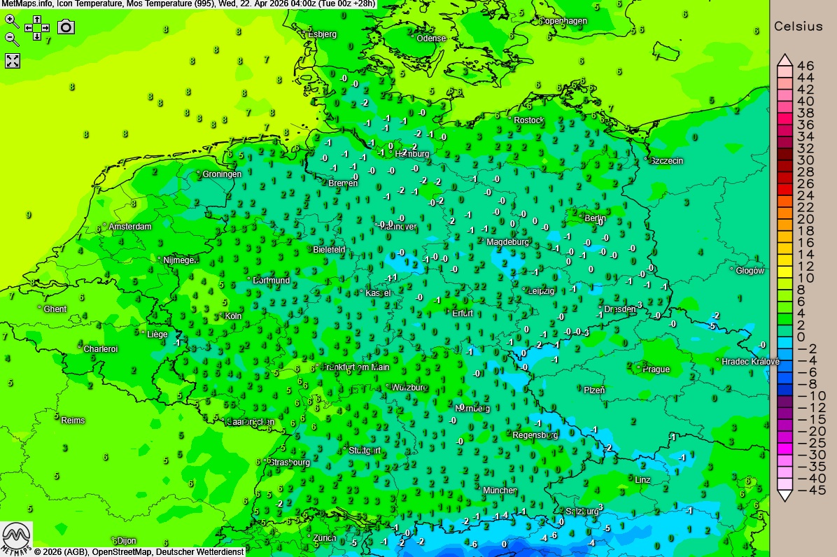 Die Folge: Die Temperaturen sinken stark ab. In der Nacht erreichen wir Tiefstwerte zwischen +5 und -3 Grad.
