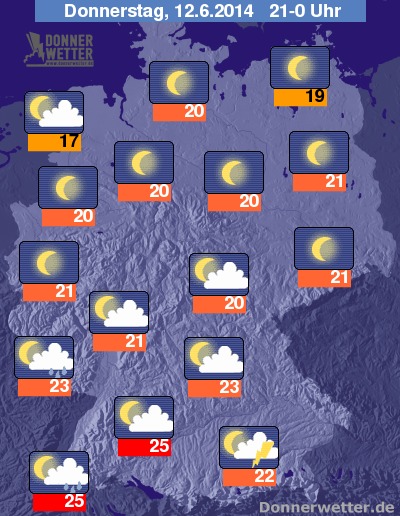 Am Abend ist es in der Nordhälfte verbreitet sternenklar und trocken. Weiter nach Süden werden die Wolken zahlreicher und hier und da ist auch ein Gewitter möglich. Die Abendwerte pendeln meist zwischen 25 und 17 Grad.