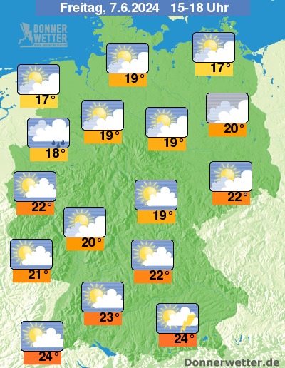 Am Freitagnachmittag ist der Himmel über dem norddeutschen Tiefland sowie südlich der Donau wechselnd oder stark bewölkt; dabei muss zeitweie mit Schauern, an den Alpen auch lokalen Gewittern gerechnet werden. In den übrigen Landesteilen ist es teils heiter bis wolkig, teils sonnig und es bleibt trocken.